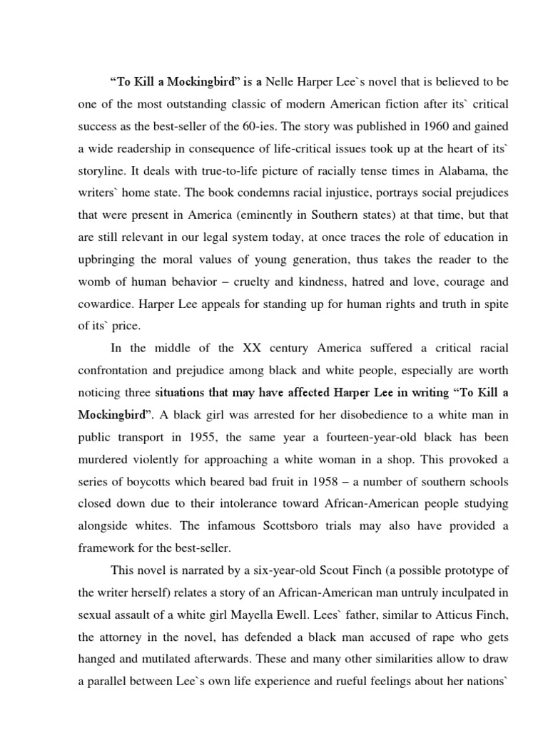 Justice and racial prejudice To Kill a Mockingbird and A Time to Kill illustrates the deep-rooted racism and discriminatory society in the timeline that was difficult to kill a mockingbird essay change the equal rights of blacks at that time. These prejudices make innocent people ineligible to justify anything they do, and most of them are black. In To Killing a Mockingbird, Harper Lee describes a story of Tom Robinson, who was accused of rape, just because he was a black man. Atticus Finch […]. Out war is spiritual.